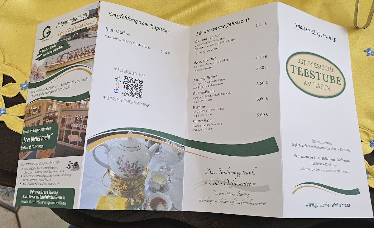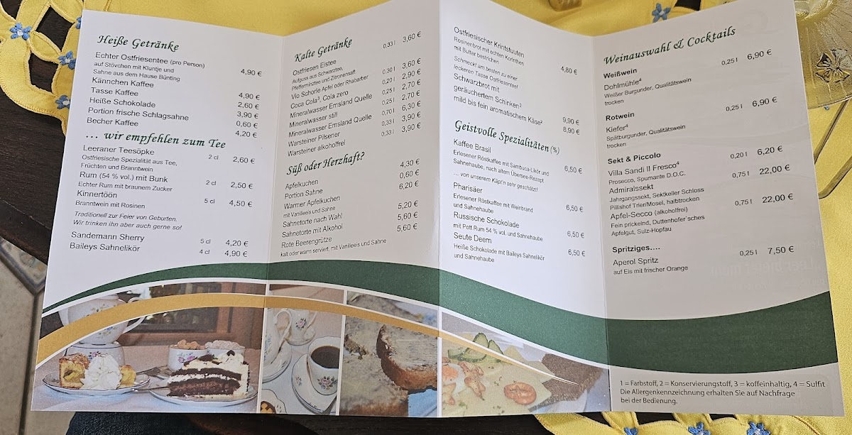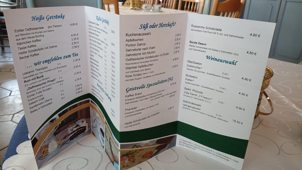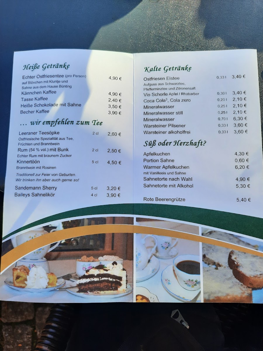 The menu at this traditional East Frisian tea room offers a variety of carefully selected teas and accompanying baked goods, reflecting the regional tea culture. Visitors can expect a range of East Frisian teas served with typical accompaniments such as Kluntje (rock sugar) and cream. The food selection includes classic cakes and tarts like Apfelkuchen (apple cake), Ostfriesentorte, Milchreistorte (rice pudding cake), Quarktorte, Himbeertorte (raspberry tart), and Käsekuchen (cheesecake).