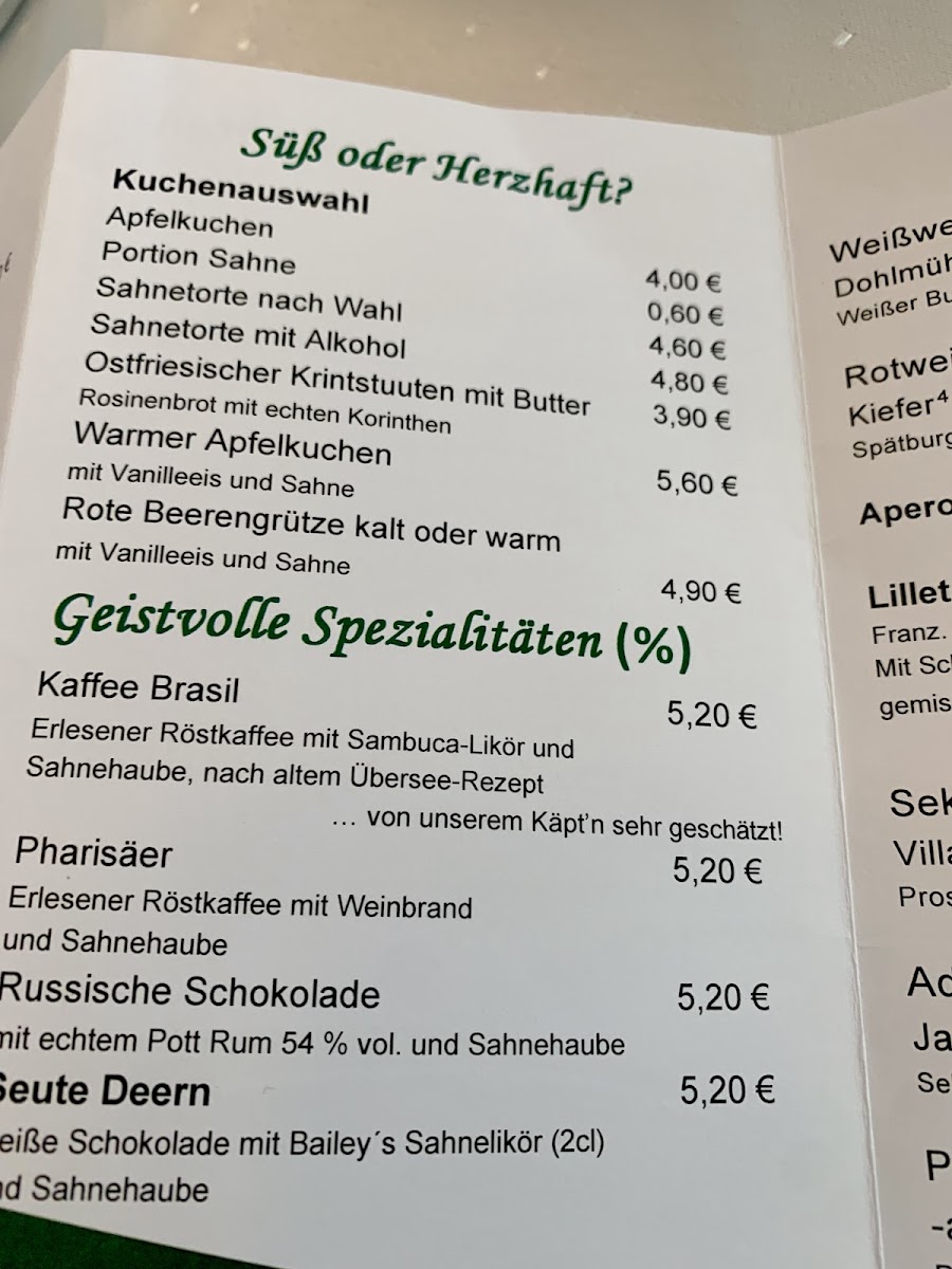 - Teas: Traditional East Frisian teas served with Kluntje and cream, including variations with a small shot (likely alcoholic).